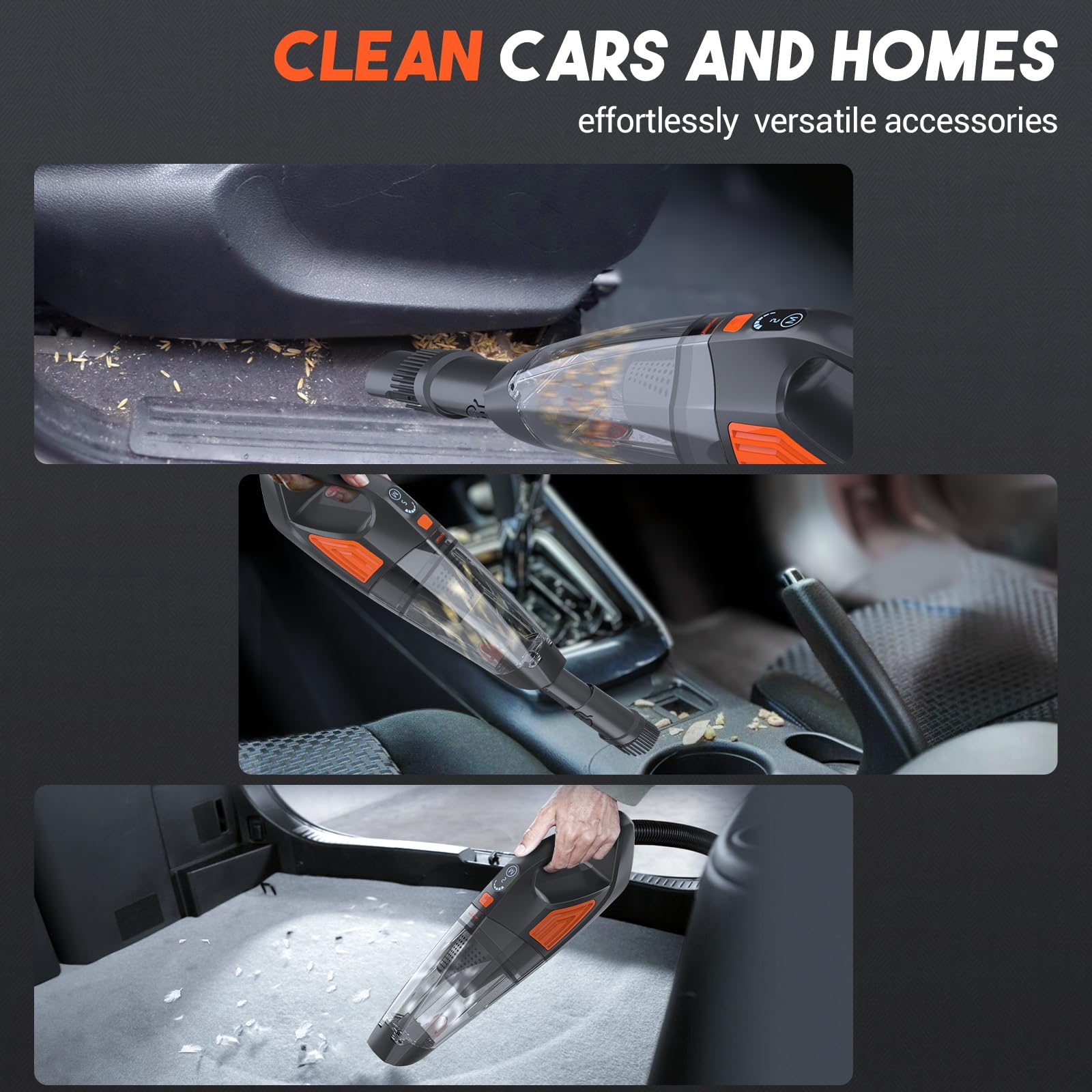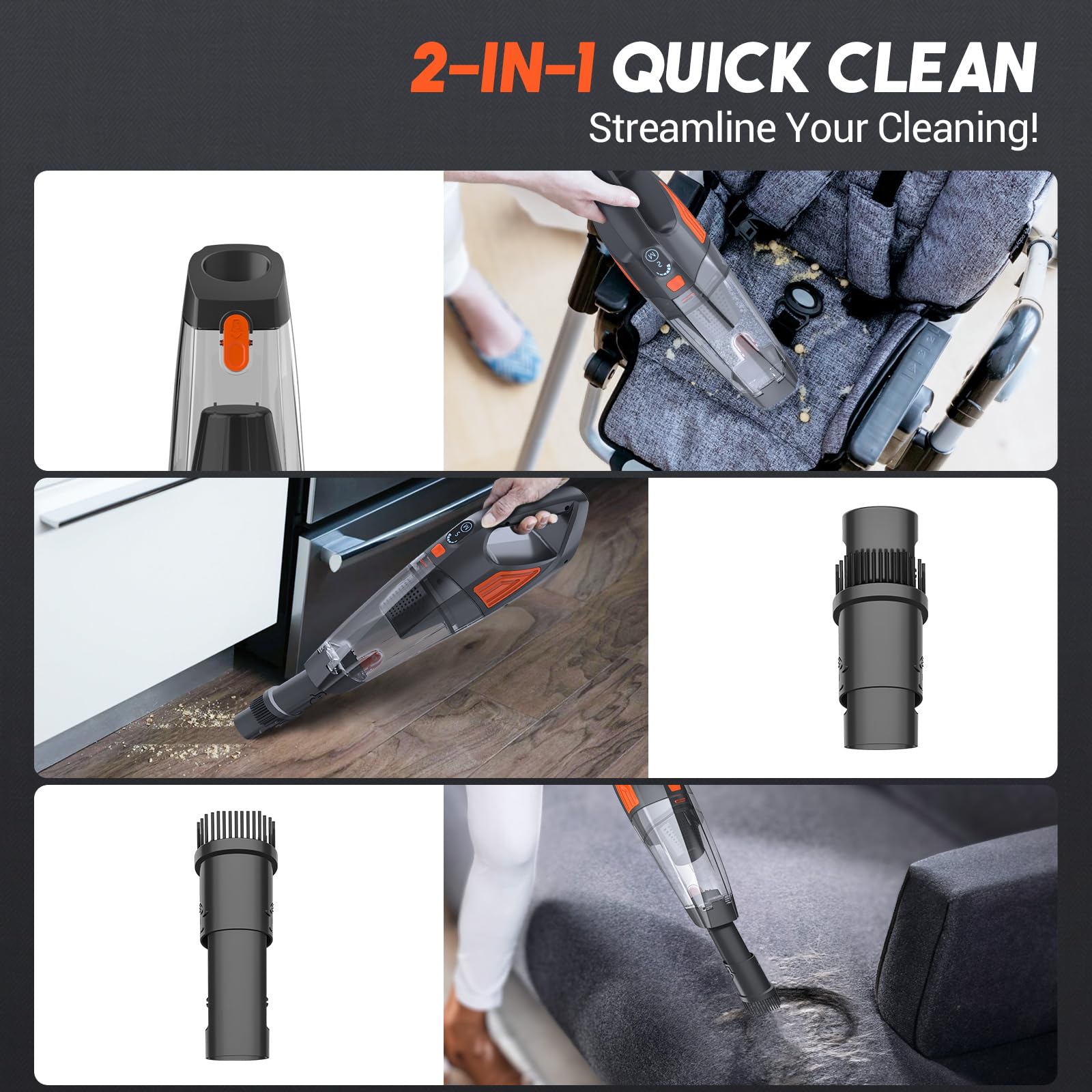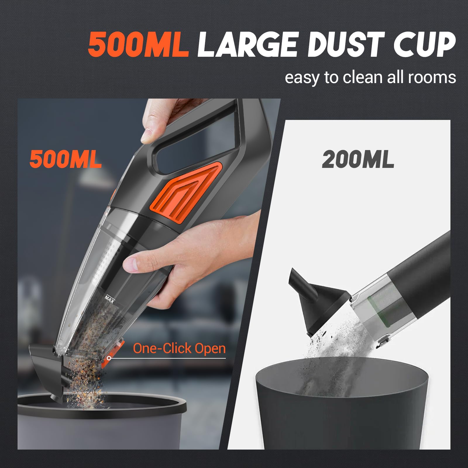 The Jeshow Handheld Vacuum comes with multiple suction nozzles to tackle different cleaning tasks effectively. Its large 500ML dust cup ensures you can clean in all directions without frequent emptying.