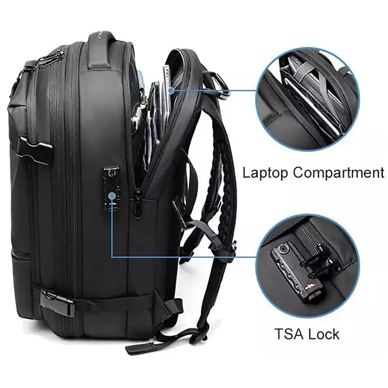 | Interior Features | 1 front panel large zipper compartment, 1 main zipper compartment with vacuum pocket, 1 back panel laptop compartment with sleeve |