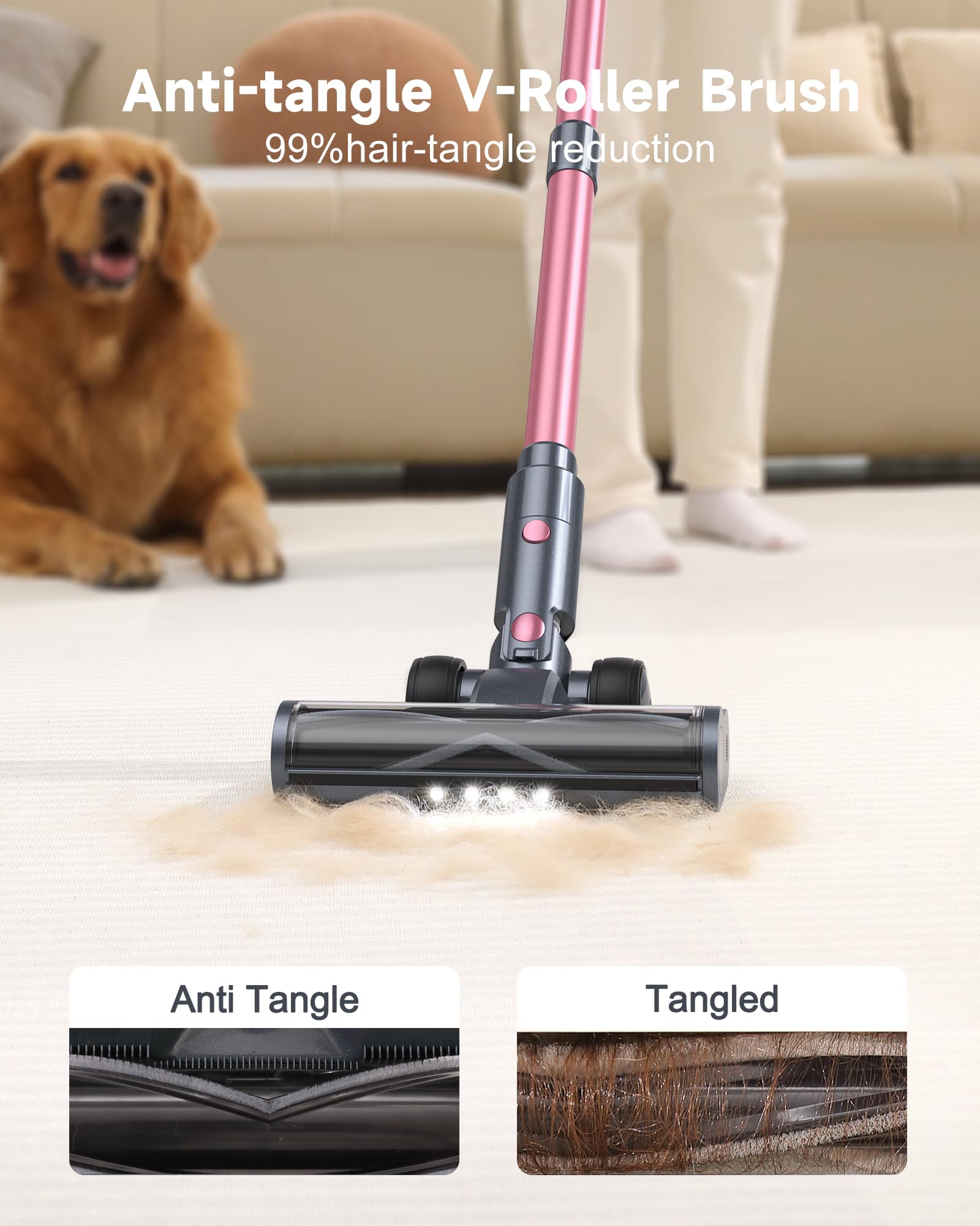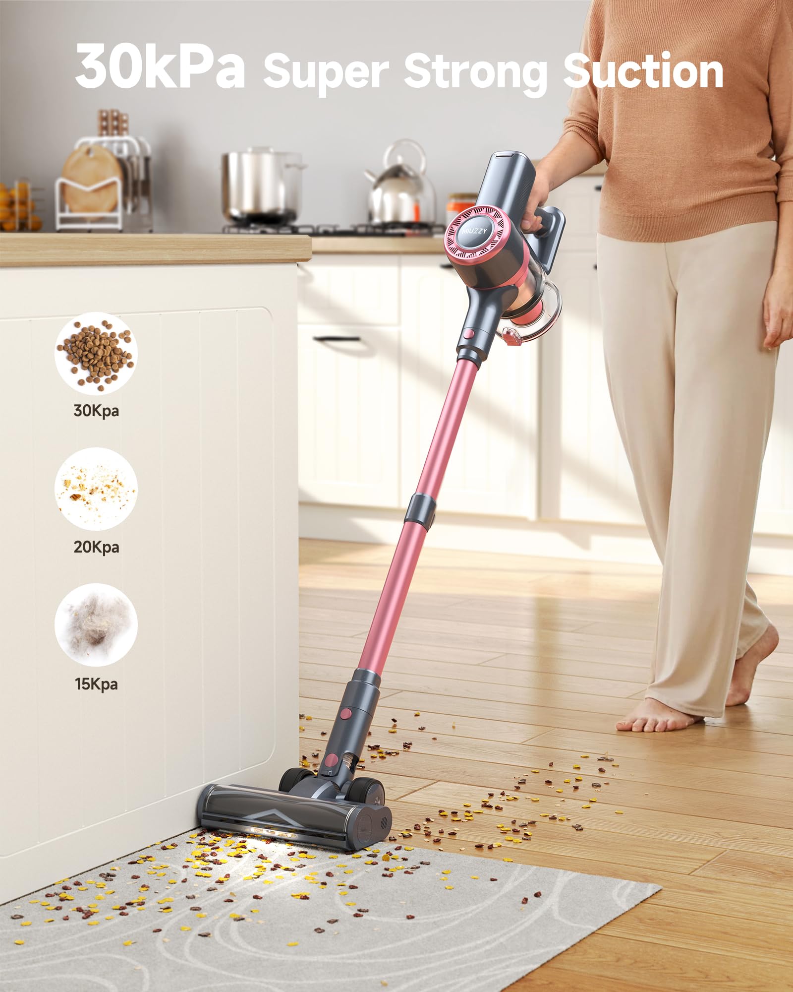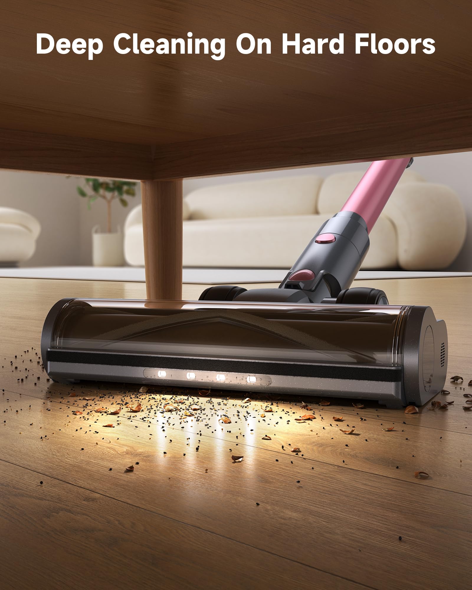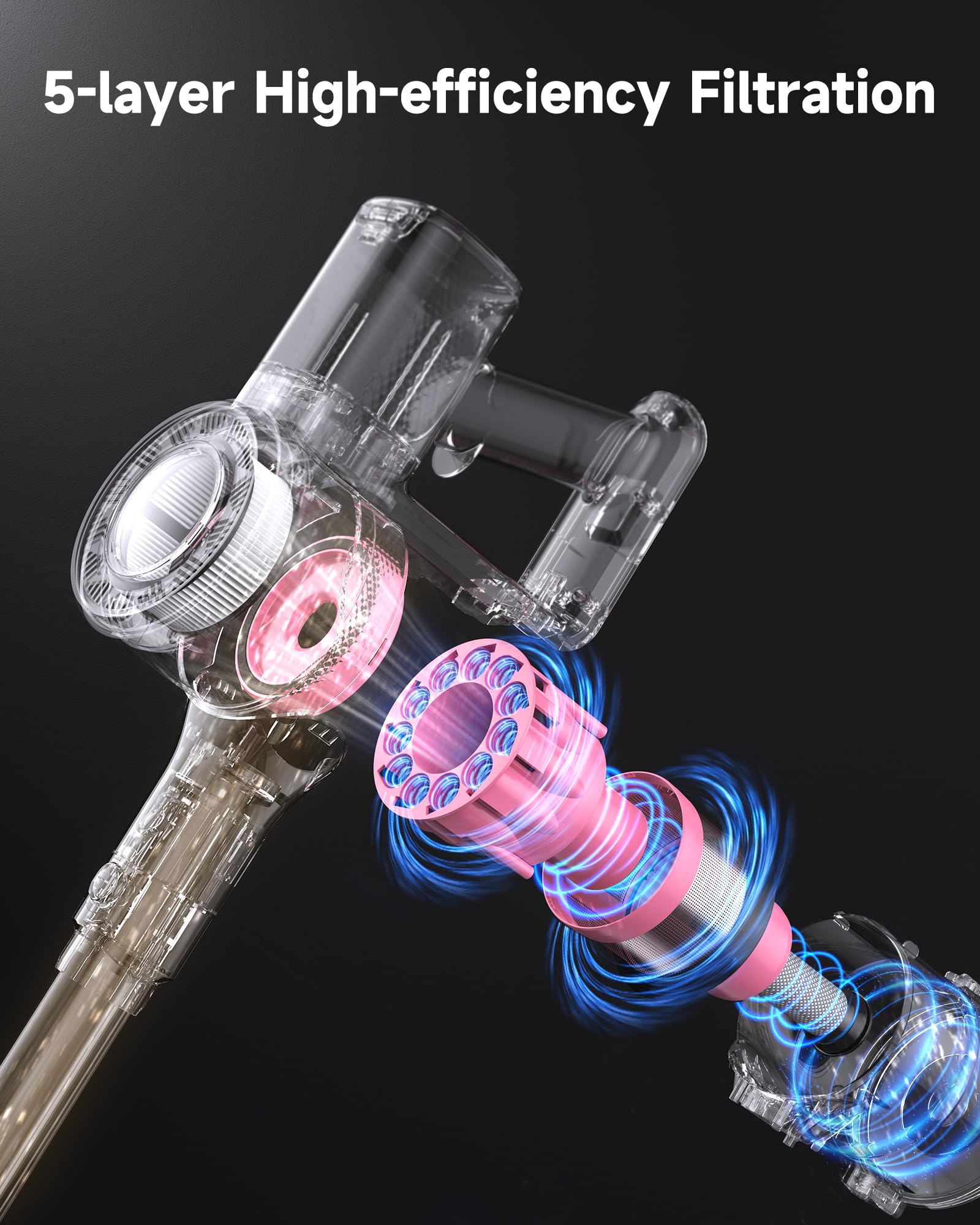 Equipped with 4 LED lights on the brush, cleaning dark corners becomes effortless. The fade-free suction power technology ensures consistent performance without any decline in suction strength. Additionally, the high-efficiency filtration system can capture up to 99.99% of microscopic dust particles, providing purified air for your family.