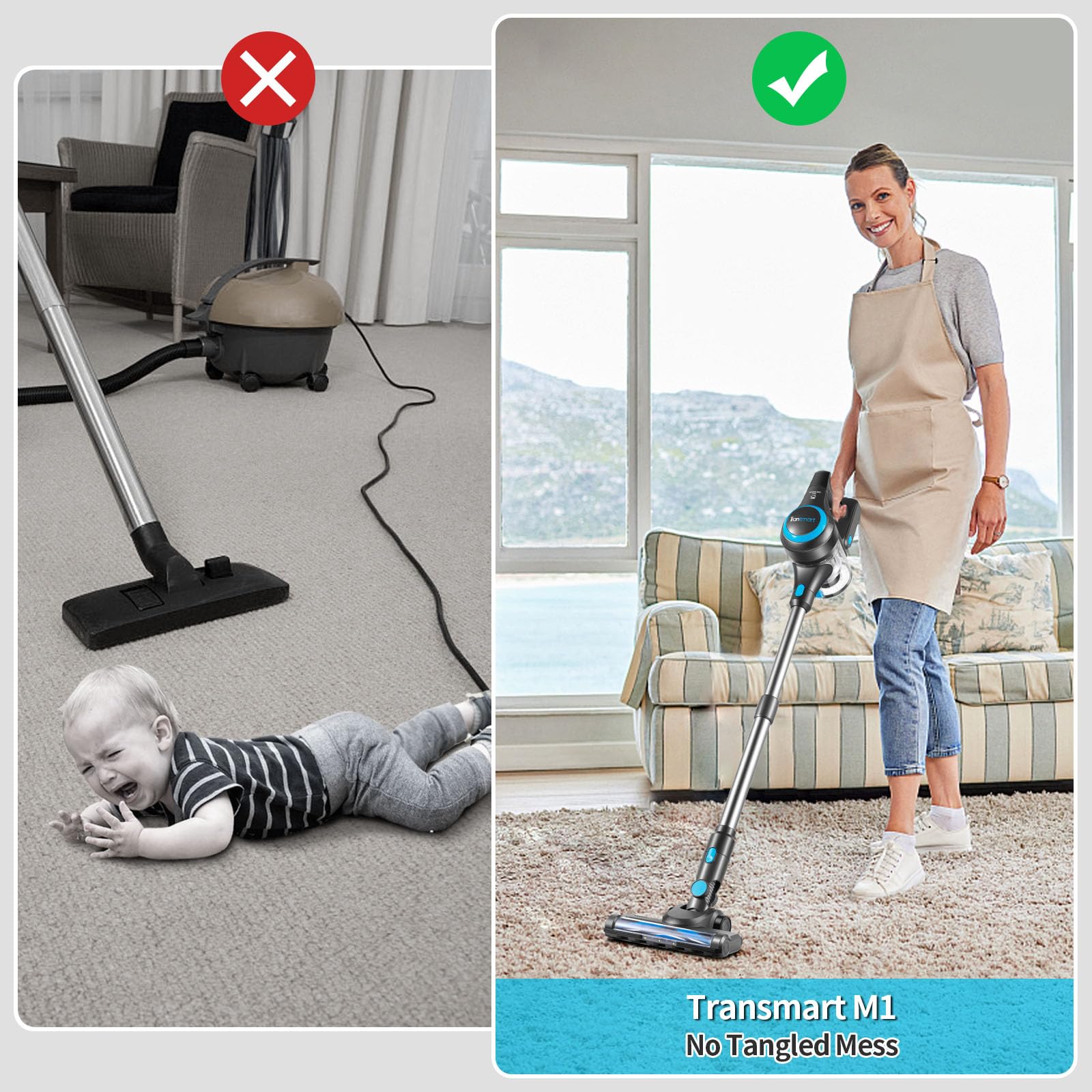 Need to reach those tricky spots under furniture or in tight corners? The Transmart vacuum’s flexible brush with strong LED headlights has got your back. Say goodbye to dust bunnies lurking in the shadows!
